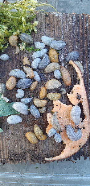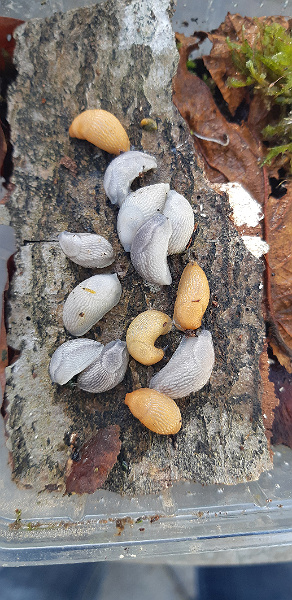 Bei den elfenbein- und schieferfarbenen Schnecken handelt es sich um Exemplare der Spanischen Wegschnecke (Arion vulgaris) oder allenfalls der Roten Wegschnecke (Arion ater ruber). Die Tiere sind vom äusseren Erscheinungsbild her nicht zu unterscheiden. Eine zweifelsfreie Abgrenzung ist nur über die DNA möglich. Beide Arten können untereinander hybridisieren, was die Artbestimmung zusätzlich erschwert.