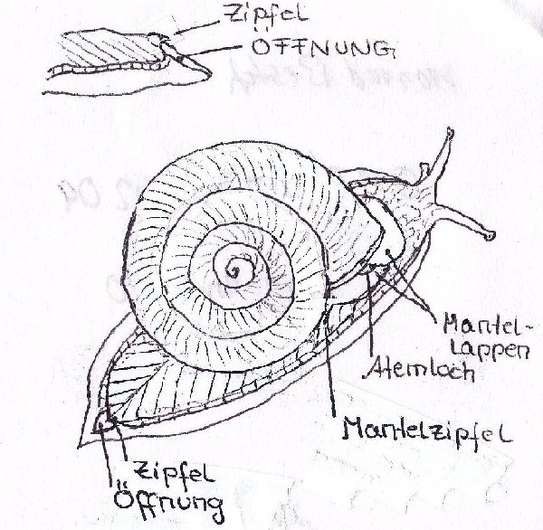 Beschreibung:Häuschen flach,ca.4cm Durckmesser, ca 2cm Höhe,rechts gewunden,6Windungen,kein Wachstumsrand zu erkennen, an den Seiten abgerundet,Farbe gelb-und Brauntöne, von unten nur gelb.Brauner Streifen an den Seiten, dort wo die neue Windung angebaut wird, von der der Streifen überbaut zu werden scheint.Der Fuß ist Karamellfarben, nur ganz vorne geht er etwas ins rötlich-Braune.Hinten hat er ein Fischgrätenmuster, vorne ist die Beschaffenheit ähnlich wie die von Achatschnecken.Der Saum ist durch einen schmalenStreifen unterteilt in kleine Segmente vom Rest des Fußes abgetrennt,der Saum selber hat keinerlei Zeichnung und sieht ein bißchen aus wie von einem Luftkissenboot.Das Fußende sieht aus, als hätte es ein kleines oberes Schwänzchen, darunter eine etwas dunklere Öffnung, darunter ein unteres Schwänzchen.Der Mantel ist von gleichmäßiger Karamellfarbe, etwas um den "Wachstumsrand" gelegt und ansonsten scheint er in mehreren Lappen auf dem Fuß der Schnecken aufzuliegen, gut einen halben Zentimeter weit.Dort wo der Wachstumsrand an die Vorwindung anschließt ist ein kleiner Mantelzipfel, dass Atemloch scheint aus 2 Mantellappen gebildet zu werden.Unten mittig am Häuschen gibt es eine Vertiefung, das Häuschen von oben ist mit zarten kalkartigen aber nicht fühlbaren Streifen versehen.