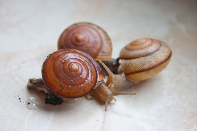 Heute Morgen hatten meine"Wildfänge" von allem gut gefressen, außer vom Romana und hingen in den Blättern.Aufgefallen ist mir noch, dass an einer Schnecke weisses Zeug klebte, ähnlich wie getrockneter Kalkbrei.
