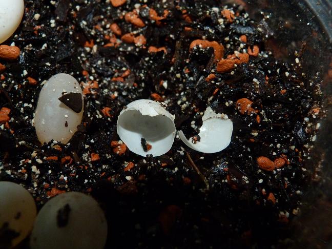 Das Baby ist nach 28 Tagen geschlüpft. Eventuell lag es noch ca. 1 Woche in dem Terrarium.