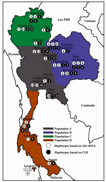 Fig 1. Geographical locations of the 4 populations of C. siamensis in Thailand, with the 14 haplotypes based on the 16S rRNA and COI sequences. Numbers inside the closed and opened circles indicates the haplotype number