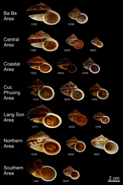 FIGURE 3 Individuals of all Cyclophorus lineages from each of the studied karst areas. Note, that individuals, which show an average morphology within the range of intra-lineage/area variation, are depicted. All specimens displayed were part of the phylogenetic and morphological datasets, except lineage 15 (specimen 15/01), which was only part of an additional version of the morphological dataset