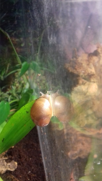 wenn alles gut geht, bescheren mir meine hübschen Megaobulimus oblongus bald Nachwuchs. Gerade paaren sich die beiden...im Futternapf...