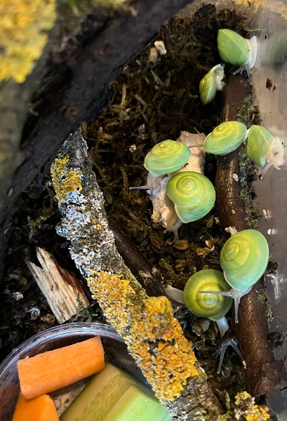 ich habe die Schnecken bei etwa 24C°bei möglichst hoher Luftfeuchtigkeit. Sie Fressen gerne Flechten und anderen Bewuchs von Ästen. Außerdem Gurke, Süßkartoffel, Kürbis. Vermutlich noch einiges mehr. Die Schnecken werden gerade von einigen Züchtern erfolgreich vermehrt. Ich denke in den nächsten Monaten kommen viele Nachzuchten auf den Markt. Ich selbst habe keine zur Abgabe. Ich suche nach Infos, oder habe danach gesucht. Gute Zeit!