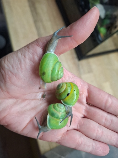 Vielen Dank für die Antworten. Bilder hänge ich gerne an. Das sind meine ersten Schnecken. Eigentlich komme ich aus der Käferzucht. So bin ich auch zu den Schnecken gekommen. Der Händler hat ab und an interessante Importe an Käfern. Importiert aber eigentlich eher Spinnen und ähnliches. Aber einmal hatte er eben diese Schnecken im Angebot, und ich war von den Socken. Auf Anfrage wie man die hält, meinte er sind unkompliziert und einfach. So habe ich drei bestellt. Und dann habe ich mich auf die Suche gemacht nach anderen die Erfahrung mit Schnecken haben. Denn ich wusste Schnecken werden gerne gezüchtet. Schnell hebe ich festgestellt, das es viel Erfahrung bei Achatschnecken gibt aber wenig bei Baumbewohnern... Na ja bis jetzt klappt es und auch die drei sind wohlauf. Bei den Nachkommen hatte ich bis jetzt bis auf 6 frisch geschlüpfte keine Verluste. Ob die allerdings fortpflanzungsfähig sind hätte ich gerne gewusst. Auf instagram habe ich nichts gefunden. Die ich dort erreicht habe sind nicht weiter wie ich. Einige der gezeigten Nachzuchten sind von mir. Ich habe einige Weitergegeben. auch an die Profis die mir geholfen haben als Dankeschön und damit erhört sich etwas die Chance das sie länger in Zucht bleiben.