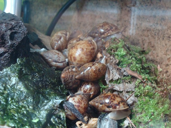 Wie ich mitbekommen habe halten ja auch einige von euch seit der letzten Hamm Börse Pythia scarabeus! Einige nette Bilder habe ich auch schon gefunden. Ichhabe auch eine Gruppe von 15 Tieren hier bei mir. Halten tu ich sie allerdings in einer Art Aquaterrarium, mit vielen Mangrovenwurzeln und Ästen, teils mit Flechten bewachsen. Der Wasserteil beinhaltet ein paar Liter Brackwasser, welches mit einem kleinen Innenfilter umgewälzt wird. Über ein kleines Ausströmerrohr plätschert das Wasser über die Wurzeln zurück ins Becken. Dadurch herrscht immer eine recht hohe Luftfeuchtigkeit im Becken und auf den Wurzeln wachsten teilweise Algen und Moose, die die Schnecken abweiden.