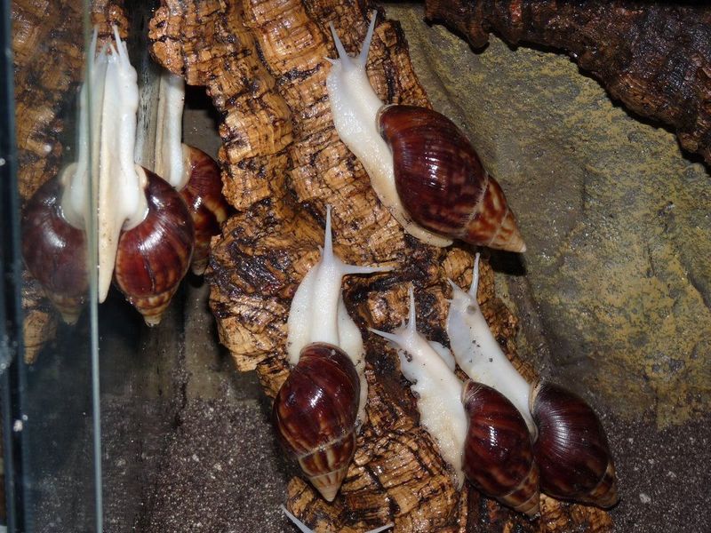 Die Schnecken (A. fulica white jade) sind in dem Terrarium aufgewachsen und haben alle schöne Häuschen ohne irgendwelche Schäden, aber bis heute hat noch keine auch nur ein einziges Ei gelegt, obwohl Temperatur, Futter, Calciumversorgung, Luftfeuchte alles ok sein müßte. Die Schnecken sind nun 2 Jahre alt!