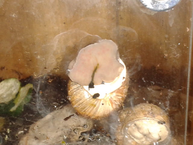 Wie der Titel schon sagt, hat eine meiner Schnecken (A.M. Ovum) Punkte unter dem Fuß.