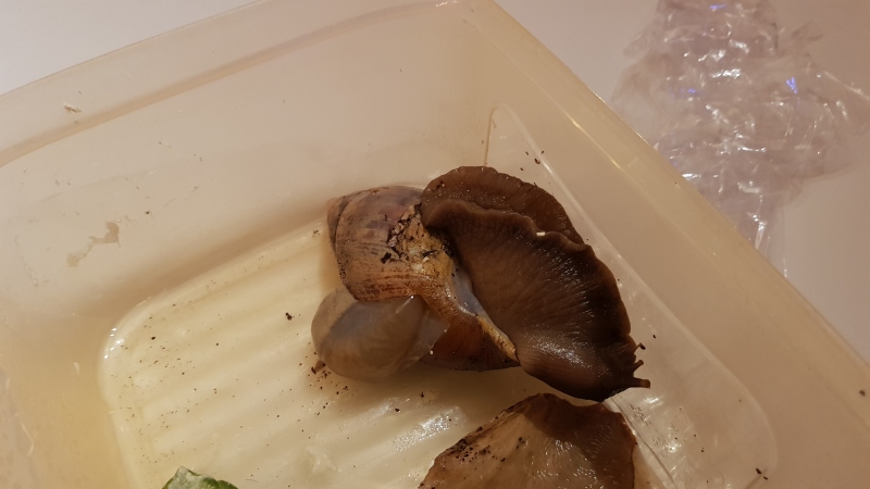 Sie ist jetzt in einer Plastebox ( mit Löcher). Hab sie so gut wie's geht sauber gemacht. Zukleben geht wohl auch nicht, da dass Innere dann anliegen würde. Sie hat erstmal bissel Wasser gegen das Austrocknen und Sepiapulver auf Gurke.