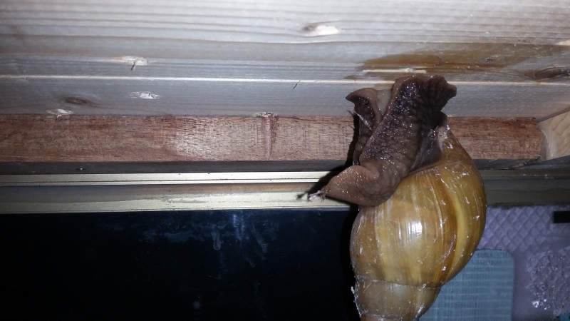 Auf dem Bild kriecht die Schnecke. Sie hing gut zwei Stunden so herum, jetzt wird sie wiede aktiv. Kommt aber auch vorne nur ein Stück raus, quasi nur so gerade eben die Augen.