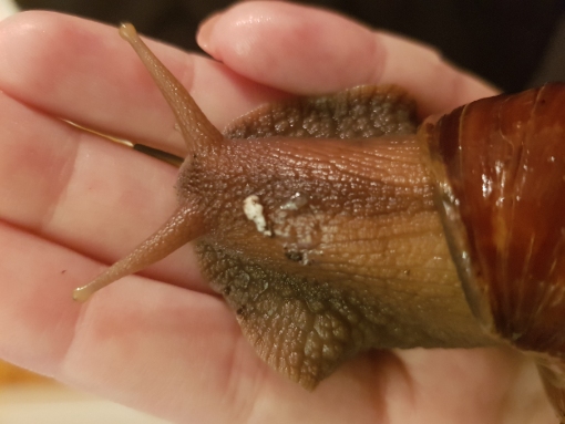 Ich glaube, die Schnecke wurde (wahrscheinlich von den Jungtieren) gebissen... in den letzten Tagen waren die kleinen immer auf den großen, manchmal sogar 2 kleine auf einem großen... Essen und Sepia haben die immer, sind die Kannibalen?