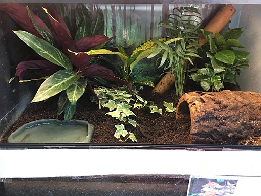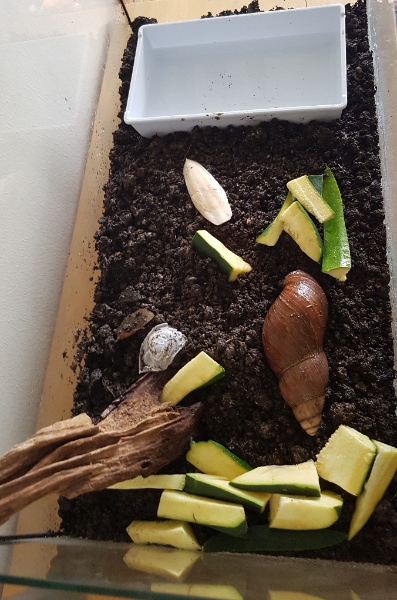 Das Terrarium habe ich mit folgenden Komponenten gefüllt: Ungedüngte Erde, Schüssel mit Wasser, Sepiaschale, Zucchinistücke (angebliche Leibspeise) und einer Wurzel. (siehe Anhänge)