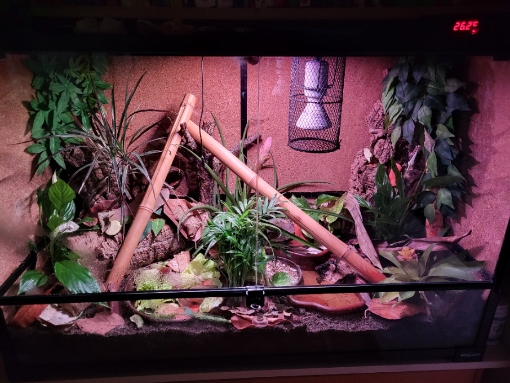 Eingerichtet ist das Terrarium mit Kork, Bambusstangen, diversen echten und künstlichen Pflanzen sowie verschieden Arten von tropischem Laub. Sie haben eine große Badeschale mit Heilerde und da drin zusätzlich noch eine kleinere Schale mit Muschelgrit und Wasser.