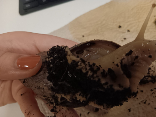 ich habe ein Sorgenkind in meiner Fulica Gruppe (5 Schnecken). Eine der Schnecken (Rotkäppchen) ist sehr stark abgemagert. Ich wiege meine Schnecken einml im Monat und allein im letzten Monat hat sie fast 20g abgenommen....das sieht man ihr auch leider an. Ich finde auf den Bildern sieht man deutlich wie klein der Weichkörper im Vergleich zum Haus wirkt und auch wie weit zurückgezogen sie ist, obwohl sie ja technisch gesehen draußen ist. Mein erster Gedanke waren Parasiten also habe ich nach Kot Ausschau gehalten in der Hoffnung dort etwas entdecken zu können. Sie hat nun aber seit Tagen keinen Kot abgesetzt, vermutlich da sie nichts isst. An Essen ist sie aber sehr interessiert wie man auf dem Vorletzten Bild sieht. Sie kommt raus und es sieht so aus als würde sie essen. Heute habe ich sie rausgenommen und versucht mit einem kleinen Gammarus zu locken. Es sah so aus als würde sie essen wollen und von nahem habe ich gesehen das der Kiefer irgendwie seltsam aussieht. Es sieht ein bischen so aus als würde sie einen Kussmund machen und fast so als würde der Mund nicht aufgehen.