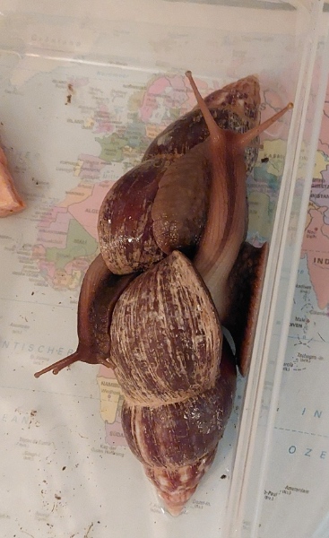 ich schreibe zum ersten Mal hier etwas auf diesem Forum. Ich hatte ursprünglich drei Lissachatina fulicas wildfarben (alle 2 Jahre alt, zwei davon 12cm groß und eine 9cm) nachdem letzten Juli ist meine dritte (9cm) verstorben ist. Wir haben daraufhin eine jüngere neue Schnecke (Lissachatina fulica White Jade 8cm) dazu gekauft um wieder eine Dreier Gruppe zu haben, jedoch starb diese auch nach ein paar Monaten. Die zwei verbliebenden habe ich dann allein gehalten, da sie ziemlich gut zurecht kamen mit sich und an die Umstände gewöhnt waren. Jetzt zum Problem: