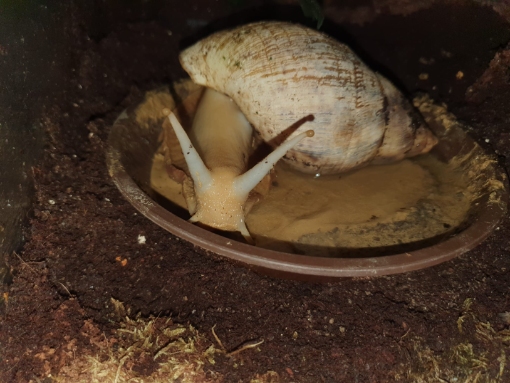 Zur Haltung wohnen die Schnecken in einem 100x50x50 Terrarium, Luftfeuchtigkeit 80-90% Temperatur mit Infarotwärmelampe Tagsüber 25-28 Grad, Nachts 20-22.