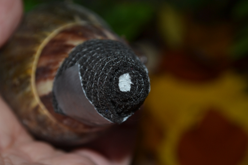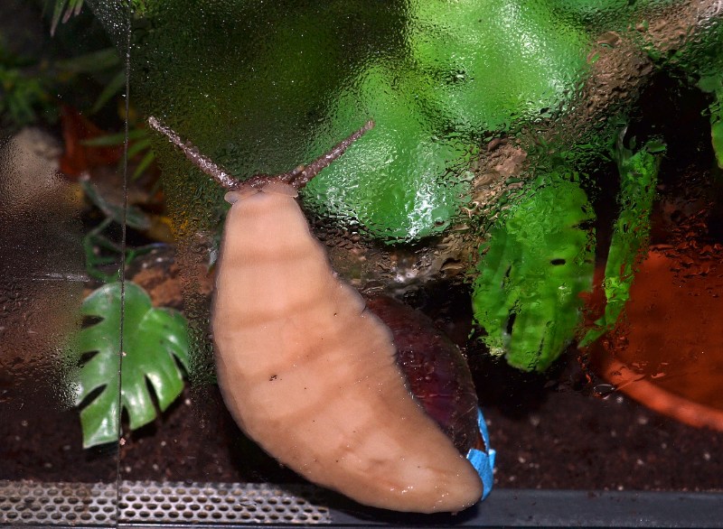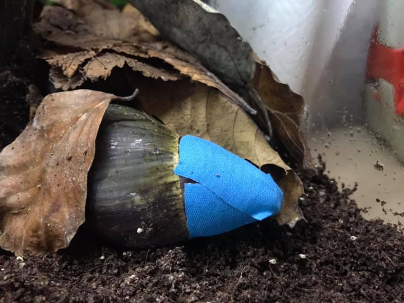 Sie ist an ihren Lieblingsplatz, unter der Terrariumdecke geschneckt. Dann hat sie ihren Apex immer wieder über den Ast, der da oben befestigt ist, "geschabt". Bis das Tape ab war bzw. daneben hing. Dann hat sie sich zum Schlafen eingezogen.