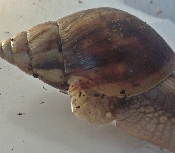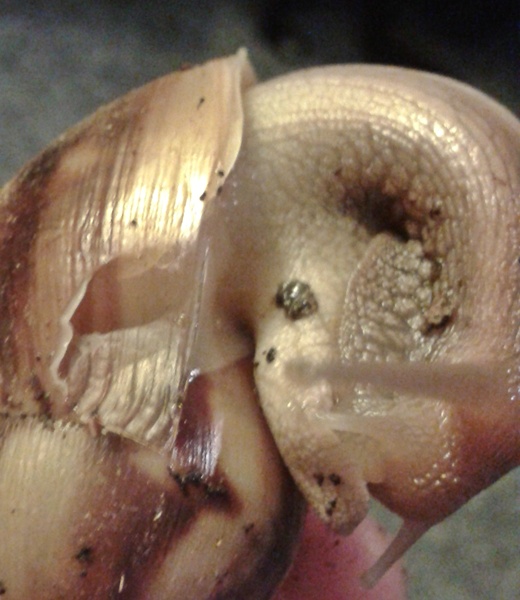 Nun hat die Schnecke ihren Mantel an der Stelle soweit zurückgeschoben, wie die Kante verläuft. Das Stück, was am Rand ist, drückt ihr leicht in den Mantel hinein, es wirkt, als sei er in dem entstandenen Spalt etwas eingeklemmt.Ich habe ihren Wachstumsrand beschädigt, der so schön makellos war.