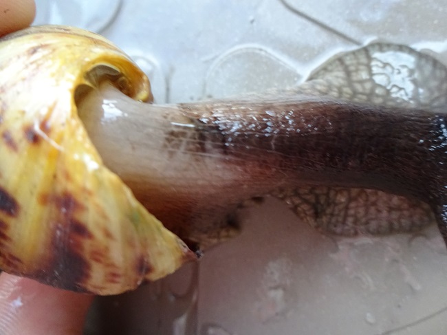 Aus Verzweifelung habe ich dann bei sämtlichen Tierärzten in der Umgebung angerufen, wurde aber immer wieder abgewiesen ("..nee...also mit SOWAS kennen wir uns ja garnicht aus...") Irgendwann hat sich eine Tierärztin erbarmt. Ich bin noch am selben Tag dort hin gefahren und habe ihr die Problemfälle präsentiert. Sie war unglaublich interessiert, hat Proben vom Gehäuse genommen und Abstriche gemacht und meinte anschließend noch "ohje das sieht ja gaaaar nicht gut aus". Ein paar Tage später kamen endlich die Laborergebnisse und mein Verdacht wurde bestätigt: Bakterien. Und davon viele Verschiedene. Die Ärztin meinte ich solle vorerst versuchen die Schnecken mit Betaisodona zu behandeln und möglichst bald zu ihr in die Praxis kommen zur weiteren Behandlung. Einige Tage später verbesserte sich der Zustand der fulica so sehr, dass ich schon gedacht habe, jetzt ist es überstanden. Vor drei Tagen war ich dann bei der Ärztin, die sofort die Reticulata behandelt hat (mit einer grünen Flüssigkeit, ich weiß leider nicht mehr wie sie heißt, habe aber nächste Woche wieder einen Termin, da frage ich nocheinmal nach). Meiner kleinen fulica geht es mitlerweile wieder schlechter und der Reticulata geht es auch nicht besser. Hier die Bilder: