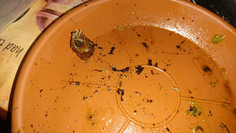 Ich habe sie damals in einem kleinen Box getan und das große gründlich gewaschen. Es sah alles eine Woche lang gut aus, also tat ich die Babys wieder in das große und tada, weitere tote und die winzigen Würmer wieder da. Also tote eingefroren und die Babys wieder in das kleine Box. Nun sieht es momentan okay da aus, aber unsicher bin ich mir trotzdem. Sie sind im warmen Exo-Terra, wo auch die Elterntiere leben. Dort habe ich solche Würmer noch nie gesehen. Im fulica-becken eigentlich auch nicht.. bis heute beim Saubermachen habe ich so 3 Stücke gefunden, wahrscheinlich sind es mehr. Ich verstehe nicht, wie sie eigentlich dorthin gelangen sind, diese Becken stehen getrennt voneinander. Vielleicht vom Futter? Eigentlich habe ich Gemüse immer gewaschen.. meine Mutter kümmert sich um sie, wenn ich für ein paar Tage weg bin.. vielleicht hat sie es nicht gründlich gemacht, ich weiß es nicht... in den 5 Jahren ist sowas mir noch nie einziges Fall unterkommen.Das war das erste tote Baby mit den Dinger, das ich gefunden habe (vor einige Wochen)