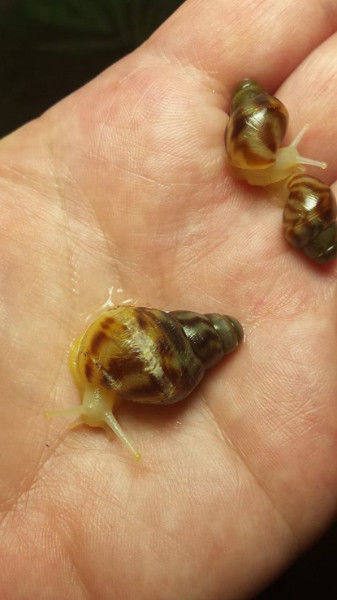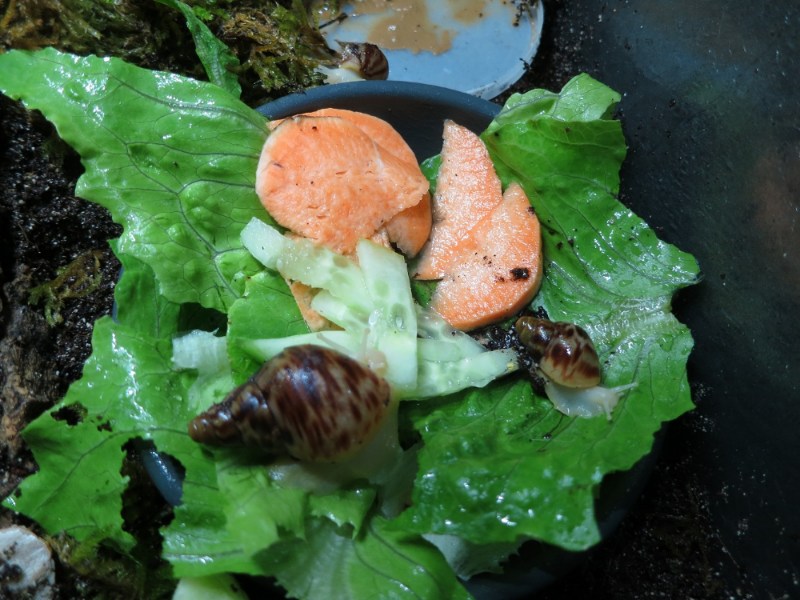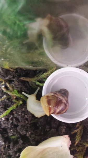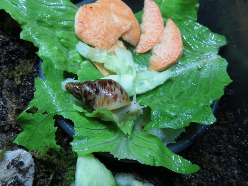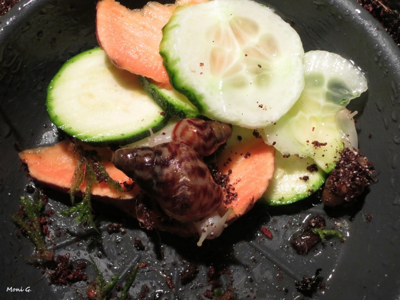 Die Versendung hatten die drei Tiere im Gegensatz zu den grösseren Schwarzköpfchen gut und ohne Beschädigungen überstanden. Sie stürzten sich auch gleich aufs geriebene Futter. Aber sie sahen schon sehr zerbrechlich aus. Wären es meine ersten Schnecken gewesen, ich glaube, ich wäre dann doch etwas überfordert gewesen. So habe ich sie in ein kleines übersichtliches Terrarium gesetzt.