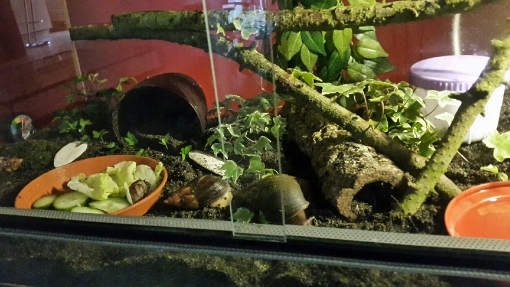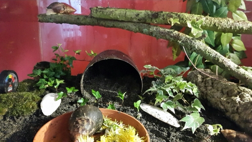 Wie alt die beiden sind weiß ich nicht genau. Ich habe sie vor ein paar Monaten aus ganz mieser Haltung geholt. Wenn die Altersangabe des Vorbesitzers stimmt müssten sie jetzt so um die 1 1/2 Jahre alt sein. Häuschenlänge 12cm.