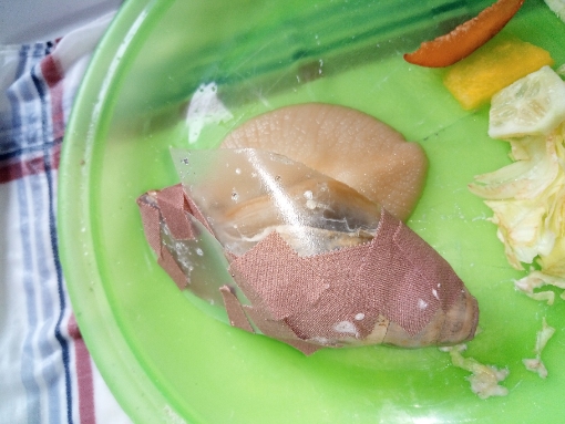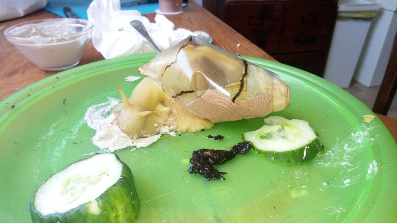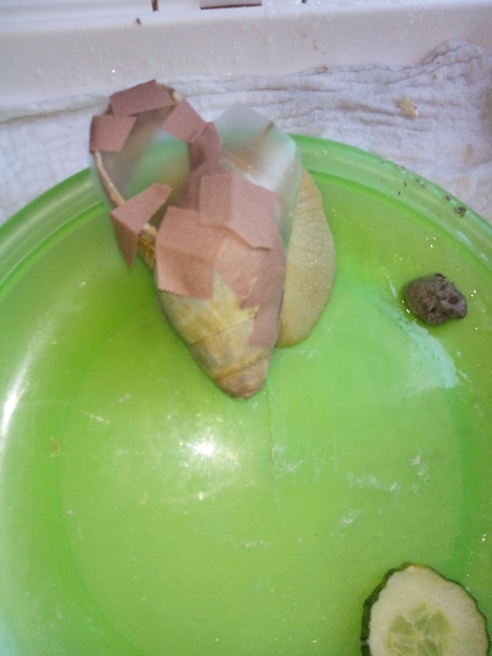 Hallo ihr Lieben ich brauche dringend einen Rat wie ihr sehen könnt ist bei meiner Schnecke das Haus kaputt, sie hat ein großes Loch zu dem sie herausschaut zuerst habe ich sie zurück geschoben, wie auf den Fotos zu erkennen ist doch ihr Atemloch lag ziemlich weit in der Schale so dass sie den Innenraum vollgekotet hatte und ich Bedenken hatte, dass sie sich infizieren könnte oder gar ersticken könnte durch die Plastikfolie konnte ich sehen, dass sie eigentlich zu der kaputten Stelle hinausgehen möchte darum habe ich gestern den Verband abgemacht und sie so gelassen wie sie es möchte lediglich einen kleinen Schutzschirm habe ich ihr angelegt ich habe scharfkantige Schalenteile entfernt... was kann ich nur tun sie hatte sich beim ersten Schutzverband zurückgezogen und so habe ich Angst dass sie austrocknet bitte gib mir einen Tipp...