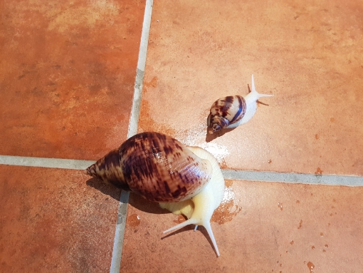 Ich habe meine Schnecken Anfang August bekommen (mit etwa 9- 10 Wochen). 4 Achatina reticulata. Alle aus einem Gelege. 3 sind enorm gewachsen nur eine ist im Vergleich dazu recht winzig. Sie isst und scheidet normal aus. Sie ist auch recht aktiv. Dennoch scheint sie nicht wachsen zu wollen. Ich habe das Essen gut verteilt so dass sie auf jeden Fall ihr Essen auch findet.