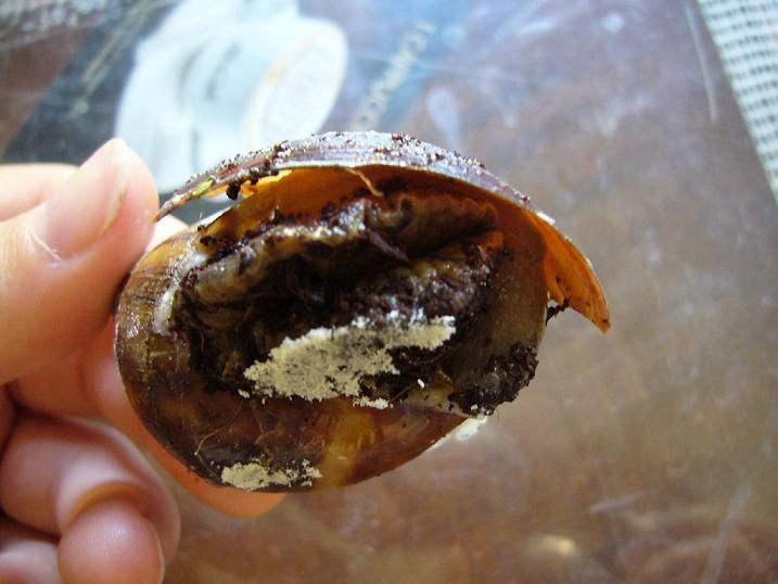 Sie hat sich dann schon ein bisschen geregt, wenn ich den Fuss berührt habe aber Sie ist nicht herausgekommen auch nicht mit ein bisschen Wasser. Zudem schaut ein Teil der Eingeweide heraus?!?! Wie Ihr auf den Bildern sehen könnt hab ich versucht die Schnecke zu verartzten indem ich über die intakte Schale ein Stück des abgebrochenen Teils befestigte. Den Teil den ich als Eingeweide vermute habe ich so zu schützen versucht...