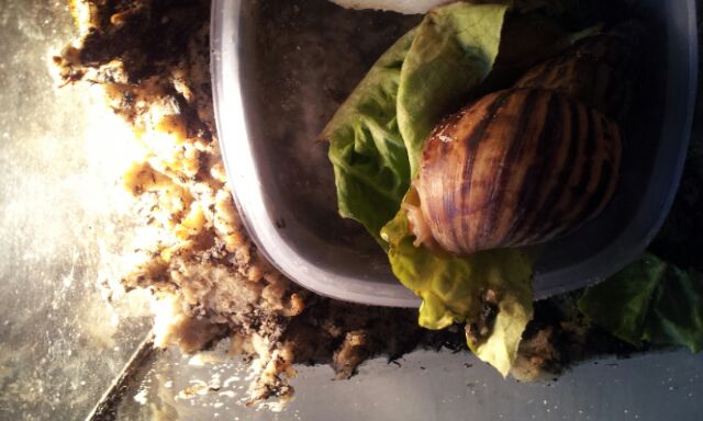 Die zimmertemperatur hab ich auf 26,5° gestellt.Der Boden ist zwar im Moment etwas nass,aber die schneck sitz oder besser liegt seit 2Tagen in ihrem Futterschüsselchen dort auf dem Salatblatt isse selbst hingekrabbelt und ich dachte die frist was.