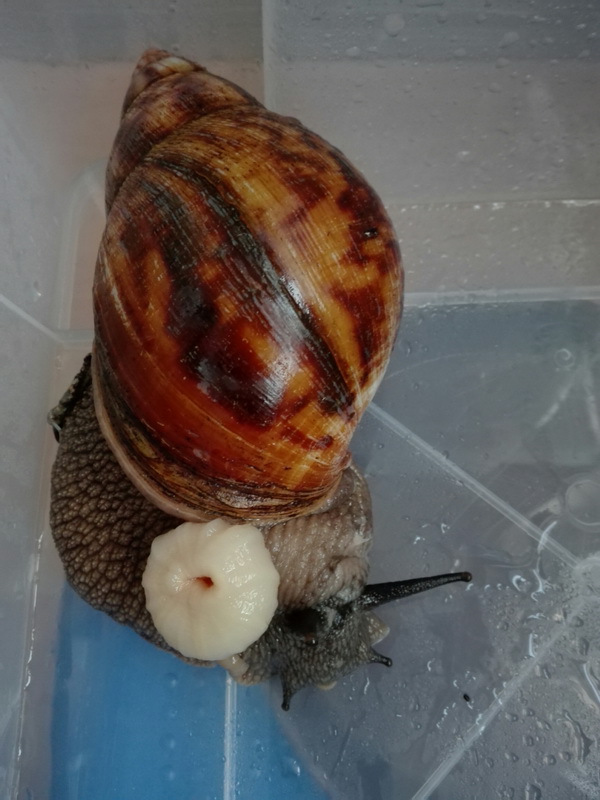 Das Geschlechtsteil der kleineren Schnecke hat er einfach wieder reingestopft, bei der Großen hat er es auch probiert, aber sie zog sich verärgert zurück, so dass er es erstmal dabei beließ. Als ich etwa eine Stunde später wieder zu Hause war, hatte sie es allerdings tatsächlich wieder eingezogen. :)