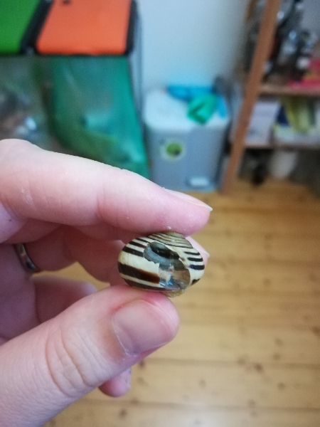 Ich lese hier schon eine Weile immer mal wieder mit und bin auch schon ein bisschen schneckenerfahren. Heute habe ich eine Schnecke mit großem Loch im Häuschen gefunden.
