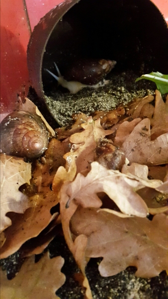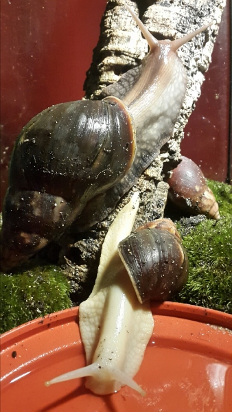 Wie alt die beiden sind weiß ich nicht genau. Ich habe sie vor ein paar Monaten aus ganz mieser Haltung geholt. Wenn die Altersangabe des Vorbesitzers stimmt müssten sie jetzt so um die 1 1/2 Jahre alt sein. Häuschenlänge 12cm.