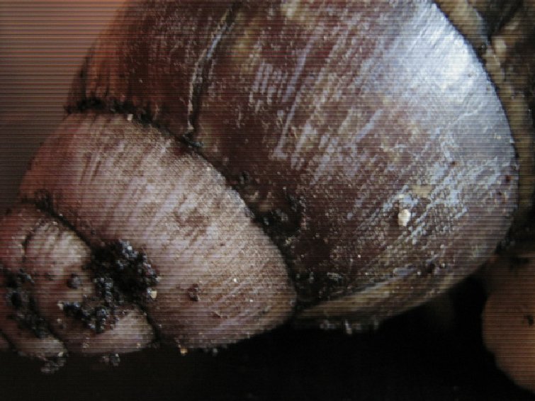 ich bin mir bei meinen neuen hellfüßigen Archachatinas mittlerweile etwas unsicher geworden.....ich schwanke zwischen puylaerti und ventricosa, wobei Andreas Leiß in seinem Buch bei der ventricosa nur von dunkler Fußfarbe spricht, bei puylaerti sagt er, dass es die auch mit albinotischem Fuß gibt. Fine hat ja auch Archachatinas aus derselben Lieferung bekommen, alle Schnecken kommen aus Togo. Die von Fine sind viel brauner als meine, und haben einige grüne Streifen, solche puylaertis hab ich auch, in der wildfarbenen Form. Meine Neuen sind aber überwiegend grün und haben etwas Braun......was meint Ihr? Ich hab versucht das Beste aus meiner blöden Kamera rauszuholen, mehr ging nicht: