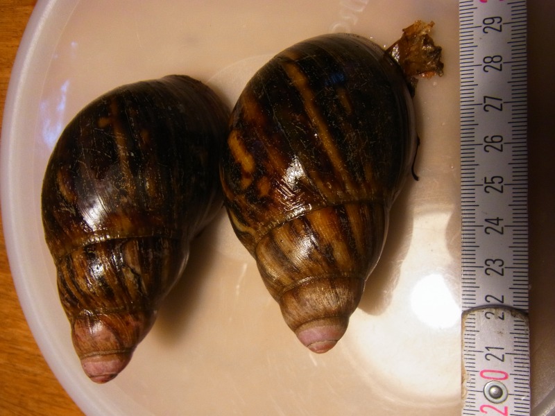 Ich habe vor 2 Wochen aus uninformierter Anschaffung 2 Schnecken übernommen.Eine Bekannte hat mich angerufen da in ihrem Freundeskreis für den jugendlichen Sohn Schnecken gekauft wurden und diese nun nichts frassen un sich nicht bewegten.Gekauft würden die Tiere als unbestimmte WF aus Nigeria.