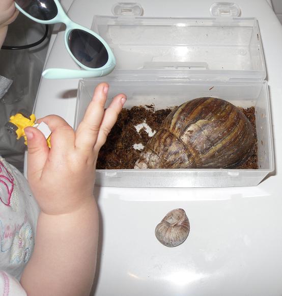 Das Foto ist nicht so ideal, aber man sieht den Größenvergleich zum Weinbergschneckenhäuschen meiner Tochter