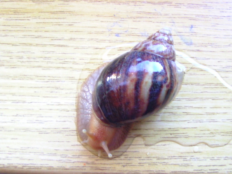 ,versuche ich die Schnecken genau zu beschreiben. Die Erste ist höchstwahrscheinlich eine Achatina Fulica, und die anderen zwei sind offensichtlich eine Archarchatina-Art: Ihr Häuschen hat so ein ganz normales braun und der Apex ist abgerundet, die Columella ist auch braun (irgendwie aber auch ein bisschen grau-bläulich) , der Körper ist cremefarben mit einem Stich ins orange. Sie sind so um die 5 cm groß.