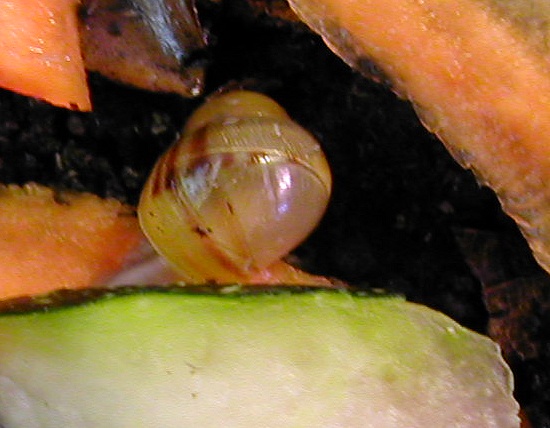 Bis jetzt habe ich 5 Jungtiere gesehen (ich habe mich sehr zusammen genommen und nicht alle Blätter umgedreht). Alle sind schon relativ groß. Drei schätze ich auf 12 bis 15 mm. Das Gehäuse ist undurchsichtig und zeigt das typische Streifenmuster von jungen Achatinas. Ein Jungtier ist etwas kleiner und hat ein deutlich helleres, aber undurchsichtiges Gehäuse. Das letzte Jungtier ist ca. halb so groß wie die ersten drei und hat eine schwach-pigmentierte, durchscheinende Schale.