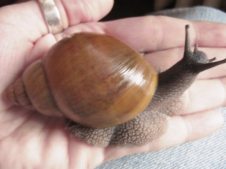 Und zwar habe ich ein Jungtier, welches von Anfang an einen hellen Fuß hatte und ein honigfarbenes Haus mit schönen dunklen Streifen. Nun dunkelt der Fuß etwas nach, von grau- rosa auf eher bräunlich- beige und das Haus verliert seine dunklen Streifen.