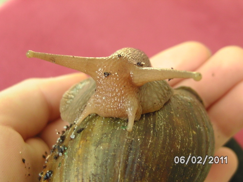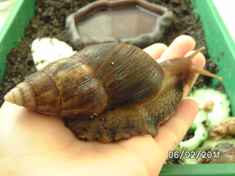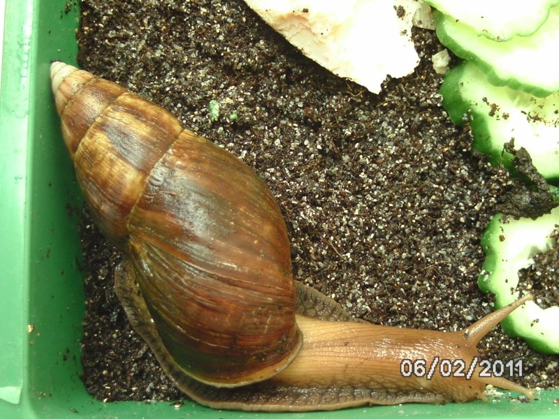 ,versuche ich die Schnecken genau zu beschreiben. Die Erste ist höchstwahrscheinlich eine Achatina Fulica, und die anderen zwei sind offensichtlich eine Archarchatina-Art: Ihr Häuschen hat so ein ganz normales braun und der Apex ist abgerundet, die Columella ist auch braun (irgendwie aber auch ein bisschen grau-bläulich) , der Körper ist cremefarben mit einem Stich ins orange. Sie sind so um die 5 cm groß.