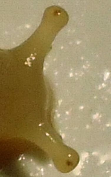 Bei näherer Betrachtung stellte ich allerdings fest, dass sie dunkle Augenpunkte haben, also eigentlich einen dunklen Weichkörper bekommen müssten, dazu fehlten dann allerdings die typischen Pünktchen.......ich bin mir auch sehr sicher, dass diese Pünktchen schon zu sehen sind, wenn die Streifen noch garnicht zu erkennen sind.