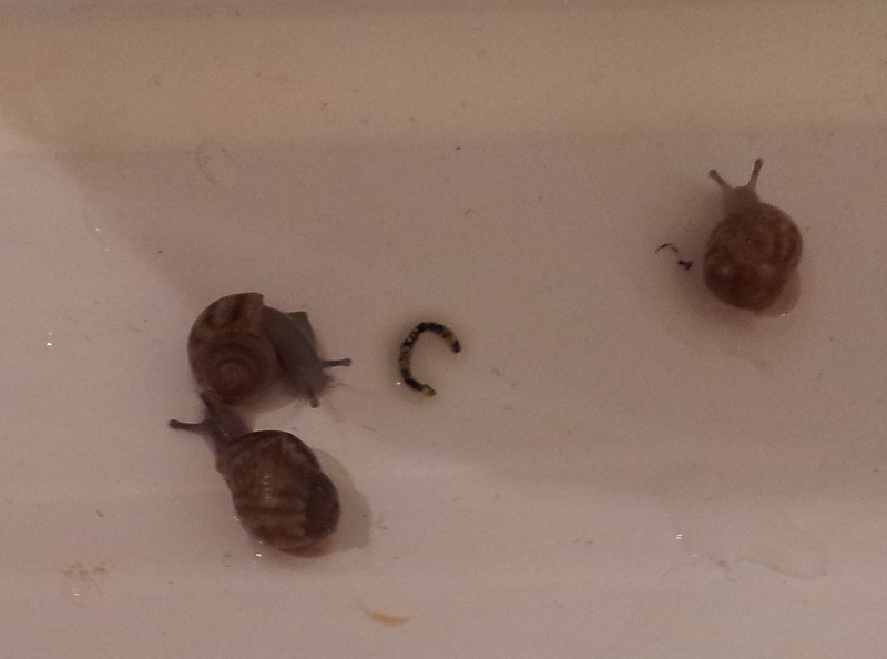 Blondies Geschwister sind übrigens: Auf dem zweiten Bild die zweite Schnecke von links (mit der vergleichsweise hellen Musterung) und auf dem letzten Bild die Schnecke oben rechts in der Ecke mit dem komischen hellen Fleck vorne am Gehäuse (diesen Fleck haben die Schnecken von Blondies Züchterin auch, habe ich gesehen).