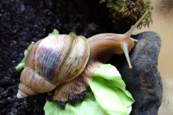 Meine Mutter hat während ihres Auslands-Urlaubs eine Bekannte besucht, deren Tochter eine Achatschnecken-Hobbyzucht (oder was man so nennt) betreibt. Meine Mutter berichtete, die Tiere hätten in einem stinkenden, sumpfigen Substrat mit verrottenden, matschigen Obst- und Gemüseresten, in denen es von Fruchtfliegenlarven wimmelte, gelebt; sehr viele zusammen in kleinen Kunststoffbehältern. Naja, lange Rede, kurzer Sinn: Sie hat zwei Tiere aus Mitleid mitgenommen, hat zu Hause gelesen, was Achatschnecken so brauchen und daraufhin sofort ein Terra 60x30x30 cm mit allem, was da so geraten wurde, eingerichtet, damit es die beiden Schnecks gut haben. Die eine ist leider recht bald gestorben, vielleicht war das mit der Umstellung auf bessere Bedingungen zu viel Stress für das Tier.