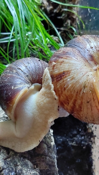 Wir haben vor ein paar Monaten eine Lissachatina fulica aufgenommen, deren Partnerschnecke verstorben ist. Gary wurde vor ca. 2 Jahren in einem Tierfachgeschäft gekauft und hatte laut Vorbesitzerin von Beginn an einen schlechten Gehäusezustand, der sich durch die Zufütterung von Sepiapulver verbessert hat.