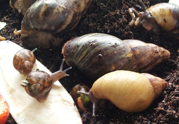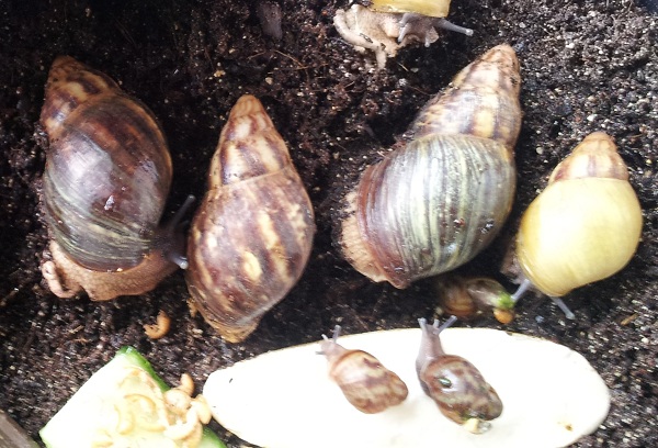 Blondies Geschwister sind übrigens: Auf dem zweiten Bild die zweite Schnecke von links (mit der vergleichsweise hellen Musterung) und auf dem letzten Bild die Schnecke oben rechts in der Ecke mit dem komischen hellen Fleck vorne am Gehäuse (diesen Fleck haben die Schnecken von Blondies Züchterin auch, habe ich gesehen).