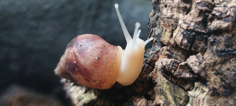 Wir haben vor ein paar Monaten eine Lissachatina fulica aufgenommen, deren Partnerschnecke verstorben ist. Gary wurde vor ca. 2 Jahren in einem Tierfachgeschäft gekauft und hatte laut Vorbesitzerin von Beginn an einen schlechten Gehäusezustand, der sich durch die Zufütterung von Sepiapulver verbessert hat.