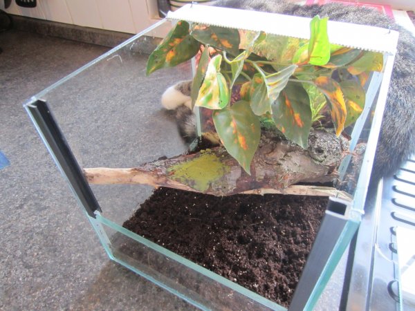 Haltungsparameter Terra: 5 Tiere auf etwa 50x30x30cm, aufgekalkter flacher Bodengrund (etwa 5cm),Sepia, Wasserschale,trockenes Laub, Wärmequelle, abgeklebte Lüftungsschlitze,Äste, Kork,Rinde,(Kunst-)Pflanzen, Juni-Ende September 21-23 Grad,LF 80-100%, Oktober-Ende Mai 25-28 Grad, LF 70-80%.Achtung: Tiere reagieren im Sommer empfindlich auf Hitze! Temp nicht über 25Grad steigen lassen!!