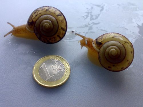 Die Schnecken sind sehr aktiv und nie verbuddelt, inzwischen haben meine E. quaesita zusätzlich zu dem schwarzen Streifen auch schwarze Punkte und Flecken bekommen.
