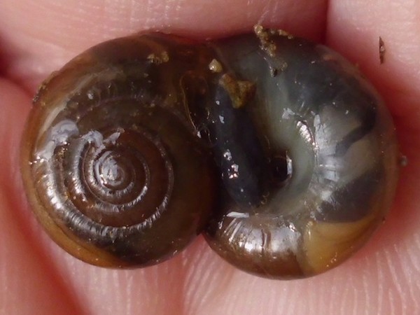 unten an der Mauer mit den Schließmundschnecken (übrigens in Essen, NRW) sah ich was Schneckiges glänzen, ich hatte es dann mit einem Zweig vorsichtig aus der Ecke gerollt.