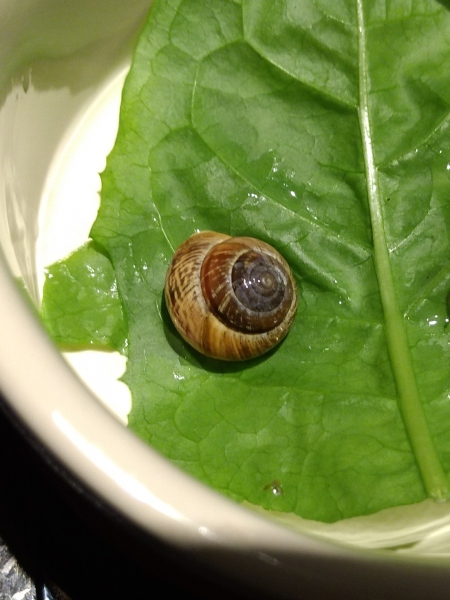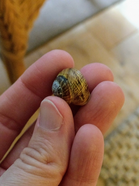 Von der Häuschenform sieht es für mich wie eine Bänderschnecke aus, allerdings ist die Zeichnung ungewöhnlich. Außerdem ist der Weichkörper zweifarbig. Der Fuß ist an der Sohle braun und oben drauf fast schwarz. Die Farben gehen nicht ineinander über, sondern sind klar getrennt.